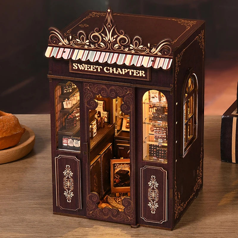 DIY Book Nook Wooden Miniature Model Kits Sweet Chapter Dessert Shop Bookend 3D Puzzle Bookshelf for Friends Birthday Gifts