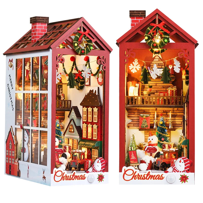 DIY Book Nook Wooden Christmas Doll House Kits Bookshelf Insert Decor With LED Light 3D Puzzle Assembly Model Bookend Xmas Gifts