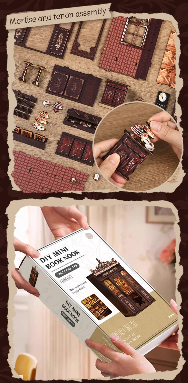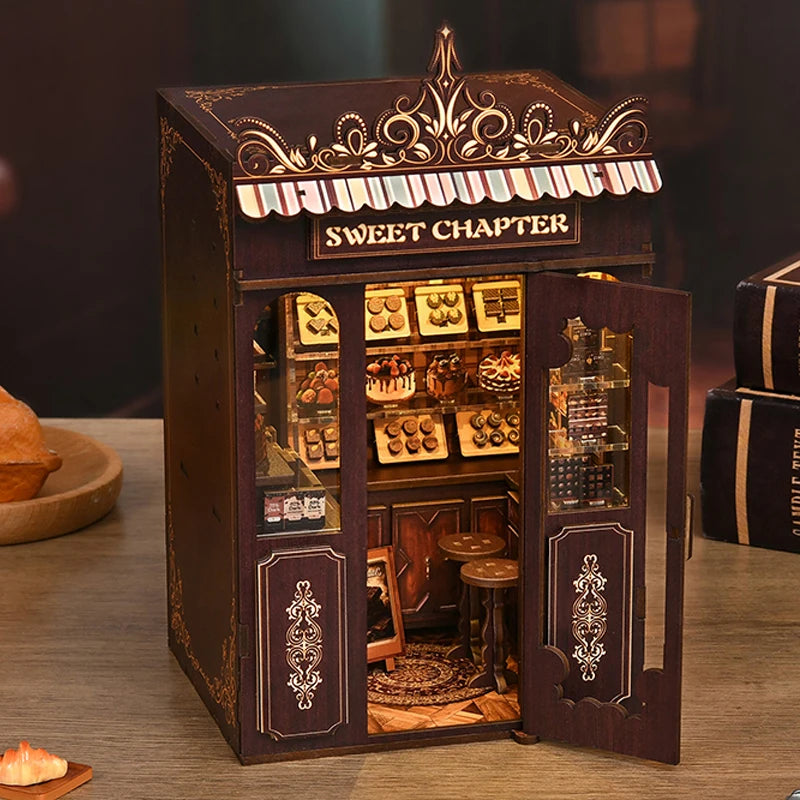 DIY Book Nook Wooden Miniature Model Kits Sweet Chapter Dessert Shop Bookend 3D Puzzle Bookshelf for Friends Birthday Gifts