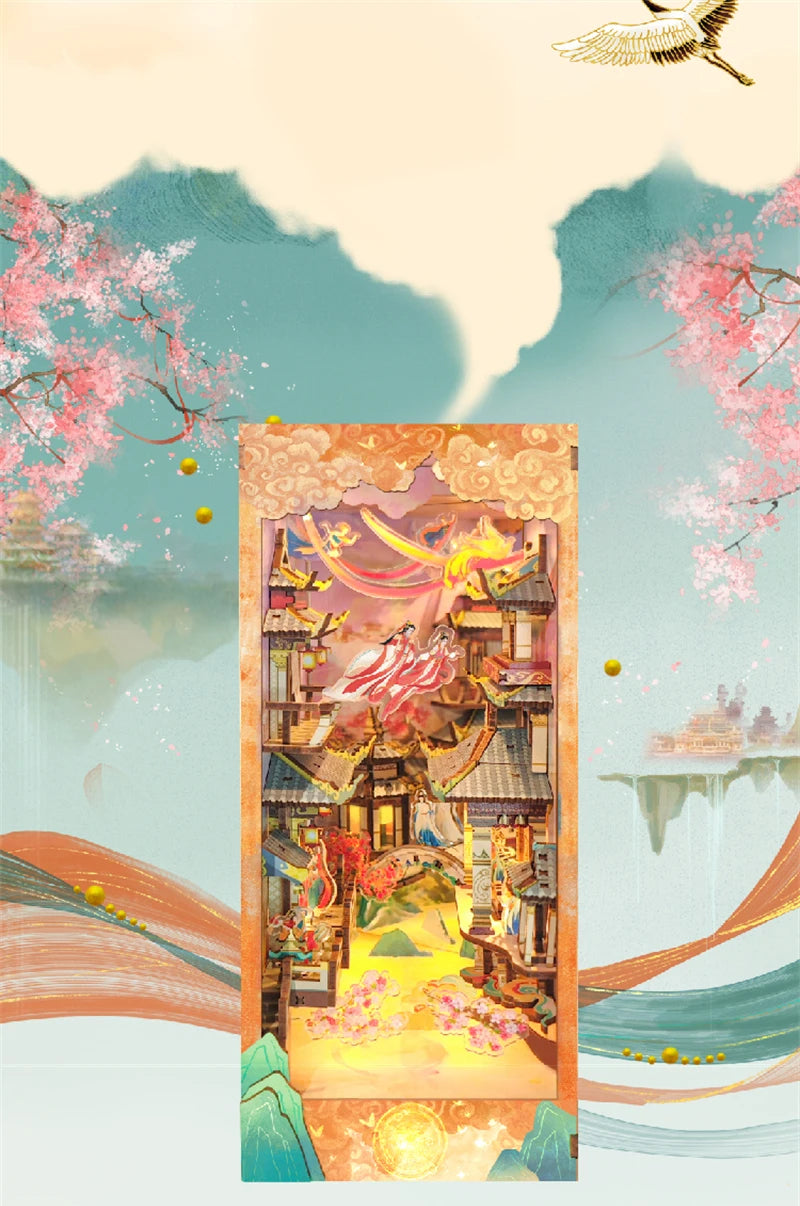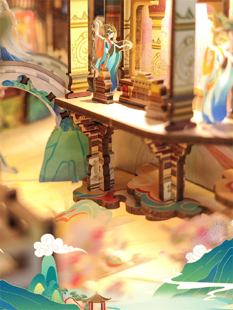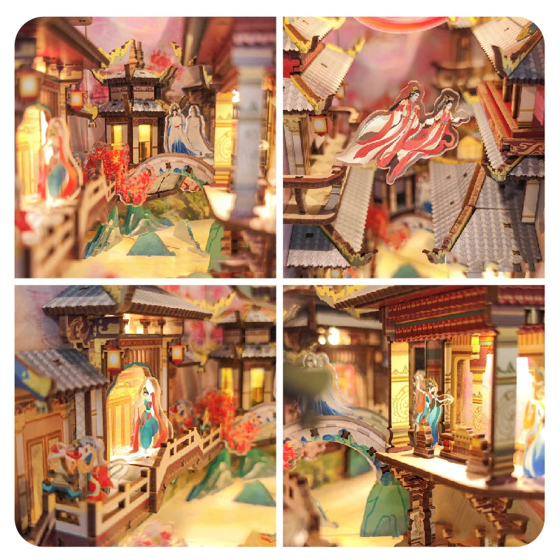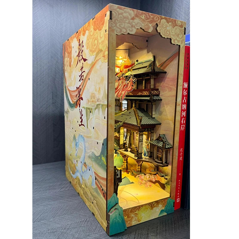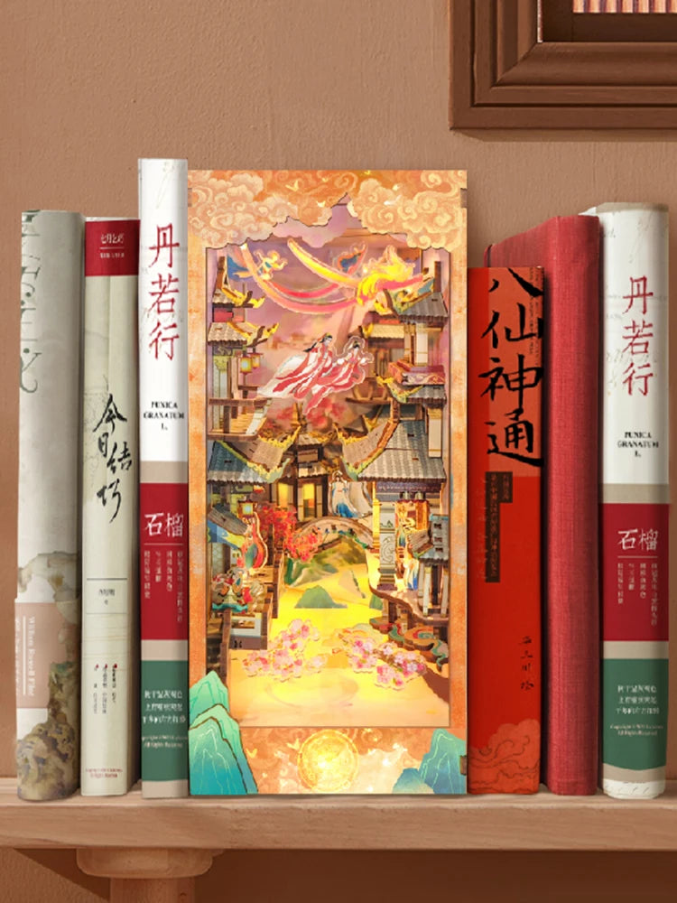 DIY Wooden Book Nook Chinese Mythical Story Bookend with Light 3D Puzzle Bookshelf Assembly Bookend for Adults Birthday Gifts